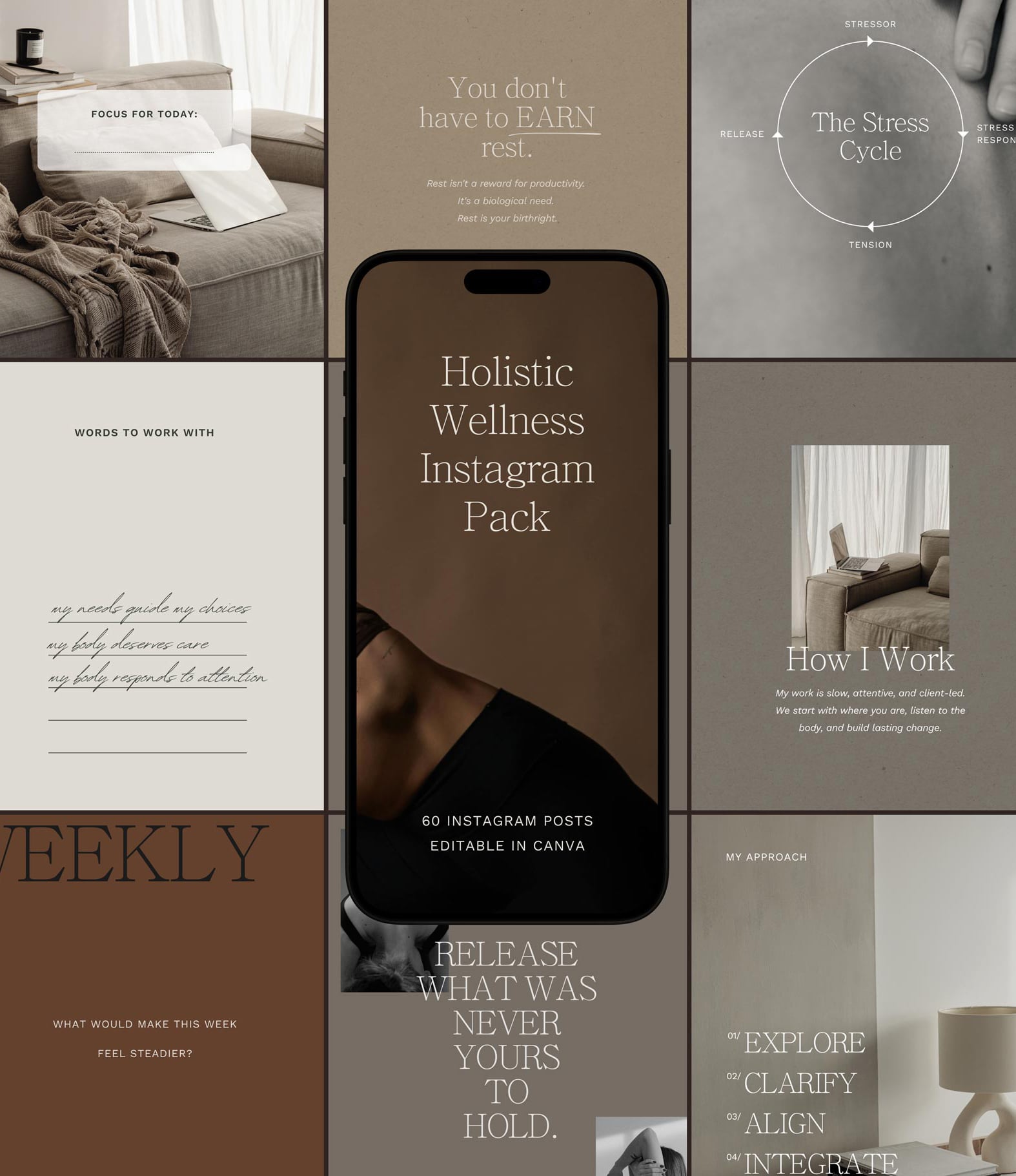 60 Instagram post and story templates for wellness coaches and practitioners.
